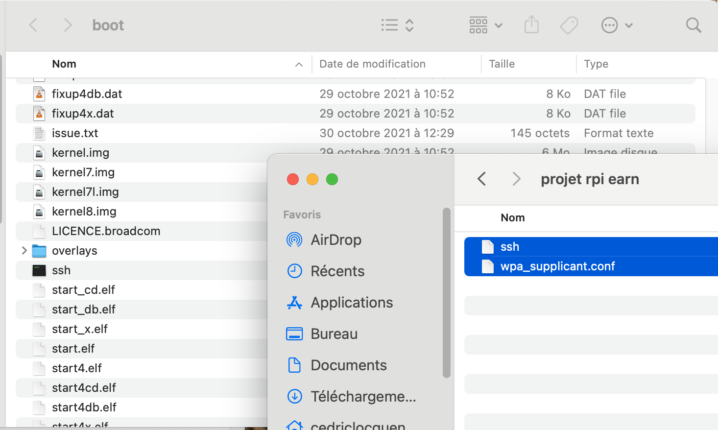 Retirez la micro SD de votre ordinateur, puis réinsérez la. Ouvrez la, et déposez y les deux fichiers créés: ssh, et wpa_supplicant.conf.