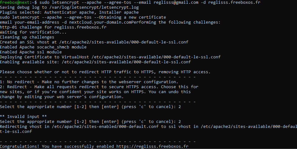 # sudo letsencrypt --apache --agree-tos --email your-email-address -d nextcloud.your-domain.com